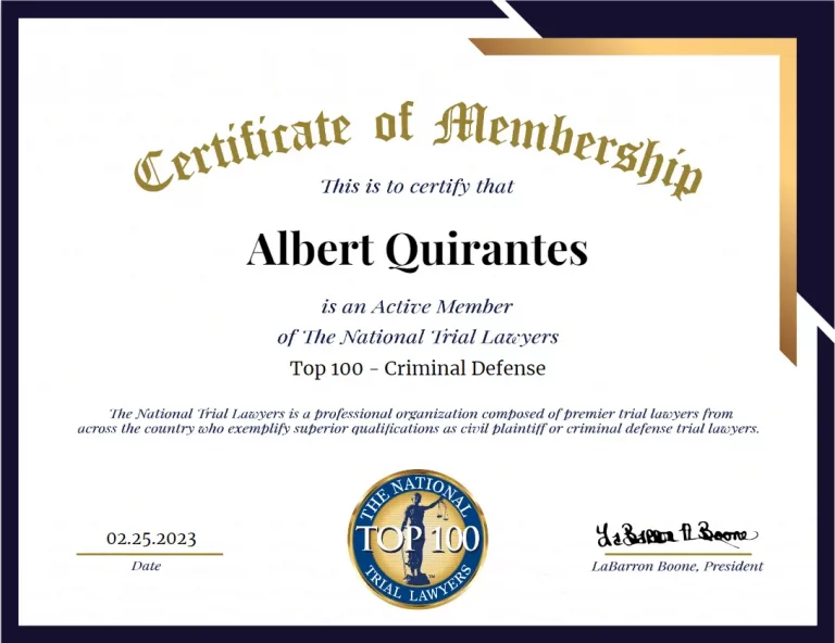 Mi equipo de abogados penales experimentados en el bufete legal “Albert Quirantes, Esq. Criminal DUI & Ticket Lawyers” están dedicados a brindarle el más alto nivel de representación legal. Nos apasiona defender sus derechos y libertades y tenemos un profundo conocimiento del sistema legal. Nuestro objetivo es ayudarlo a lograr el mejor resultado posible en su caso, manteniéndolo fuera de la cárcel y limpiando sus arrestos y registros judiciales.